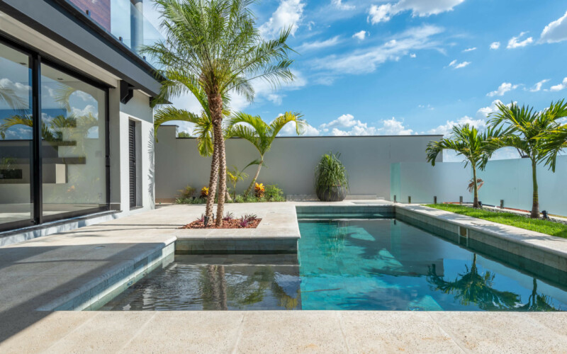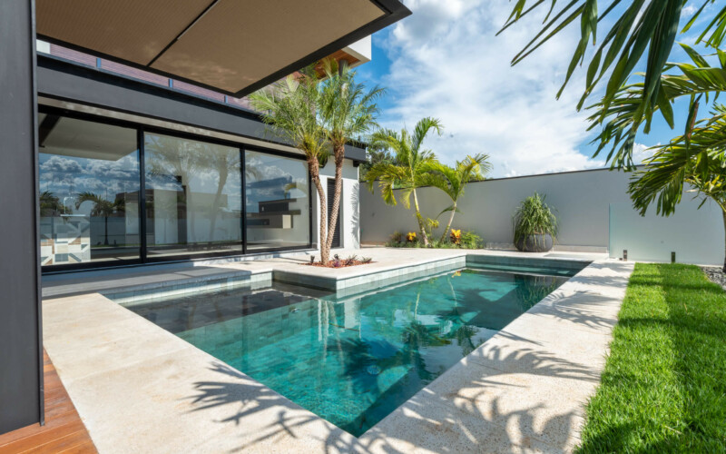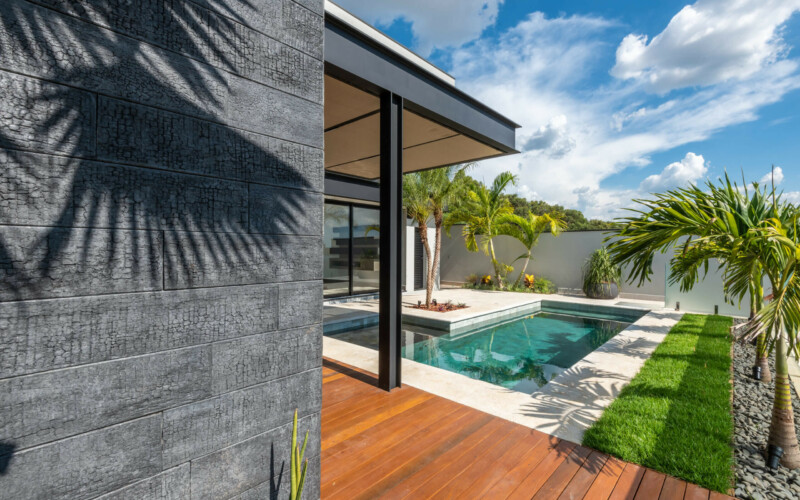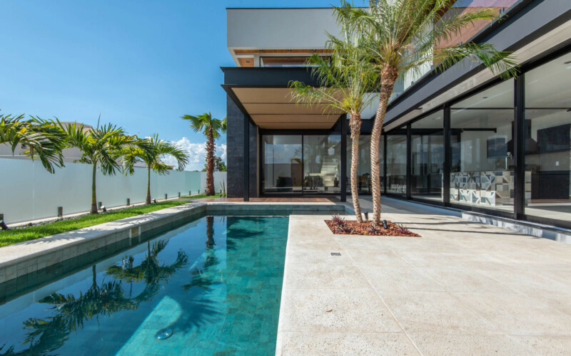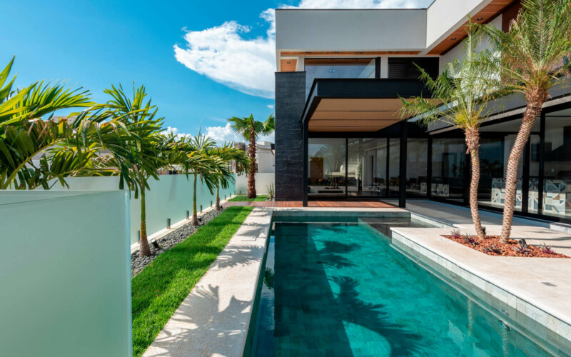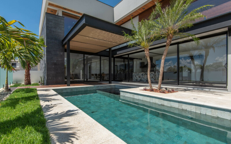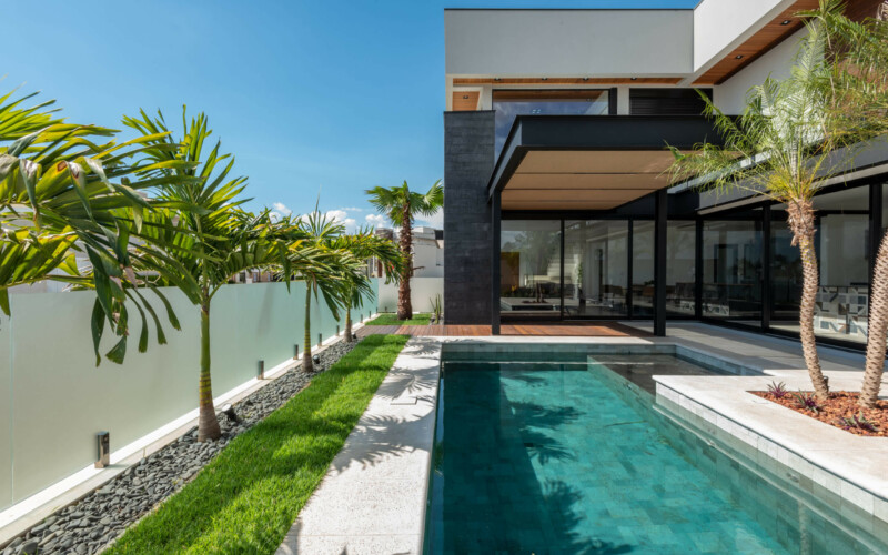 A casa DM01, localizada na esquina de um loteamento fechado em Indaiatuba-SP, tem na distribuição, um dos seus pontos fortes. A garagem da acesso a duas ruas e impede o enclausuramento de carros. O perfil do terreno, levemente acidentado, permitiu que a área de lazer, mesmo no térreo, fosse elevada e mesmo assim, mantivesse a privacidade da vista da rua. Estruturalmente a casa foi construída com um sistema misto de concreto armado e estrutura metálica, a qual possibilitou grandes aberturas e integração do pavimento térreo.