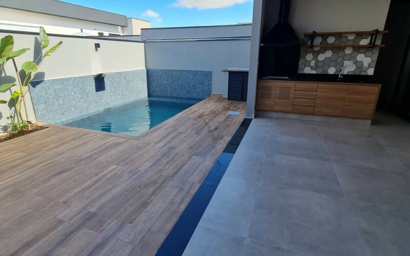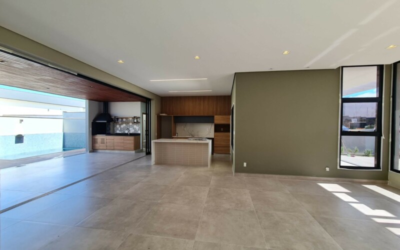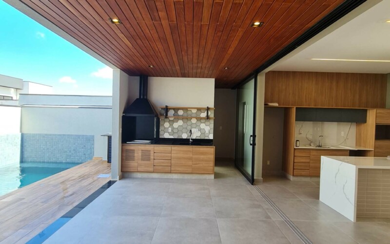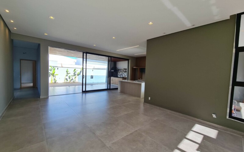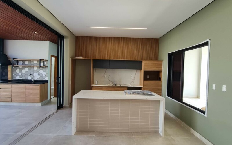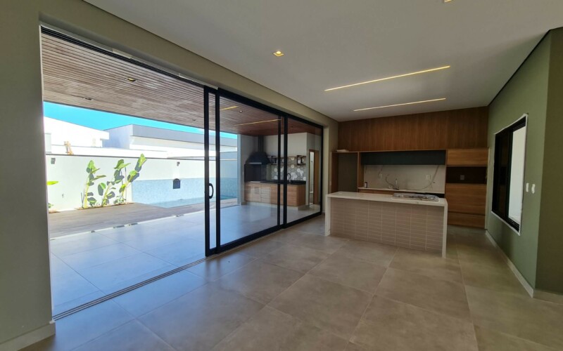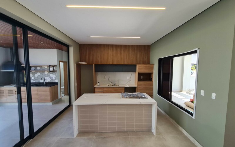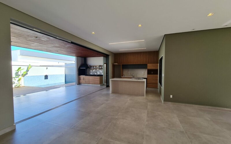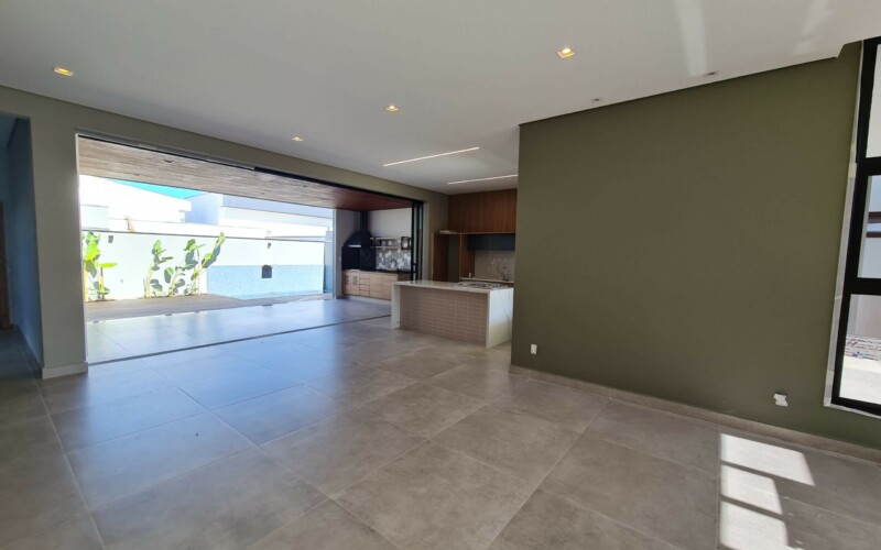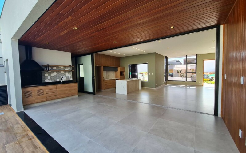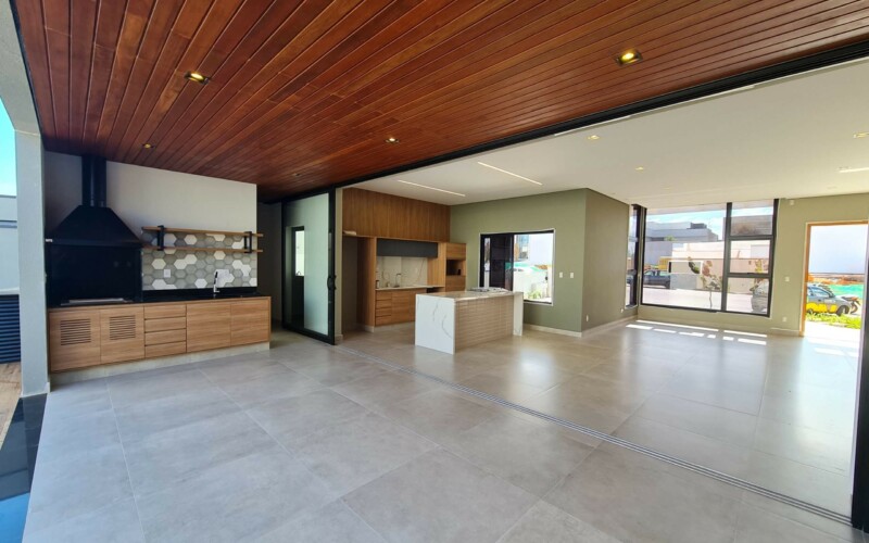 São 3 suítes, sendo uma master. Hall para escritório de frente a área de luz. Garagem confortável para 2 carros coberto e outros 2 descobertos, fachada moderna, com amplos panos de vidro e revestimento em porcelanato cinza e piso fulget no recuo frontal. Porta social ripada com acesso a ampla sala de estar, integrada com sala de jantar e cozinha, separada por uma porta ampla de vidro, que corre por fora da parede, aumentando ainda mais a sensação de integração. Ampla área gourmet com teto em madeira e lavabo/sanitário externo bem privativo, garantindo amplo uso e privacidade. Acesso externo, de serviço ou lazer, atraves de porta na garagem, onde se encontra ampla área de serviço com espaço para depósito.